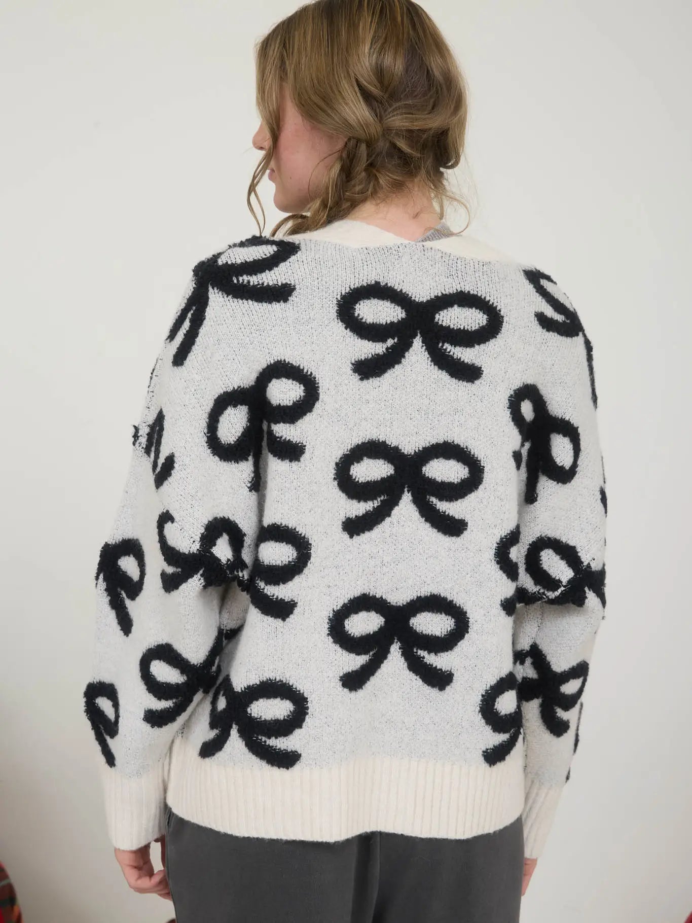 V neckline Long sleeves Drop shoulder Extended shoulder Relaxed fit Oversized Bow jacquard pattern Knit cardigan sweater Wool blend 30%recycled polyester 30%acrylic 20%polyester 14%nylon 4%wool 2%spandex