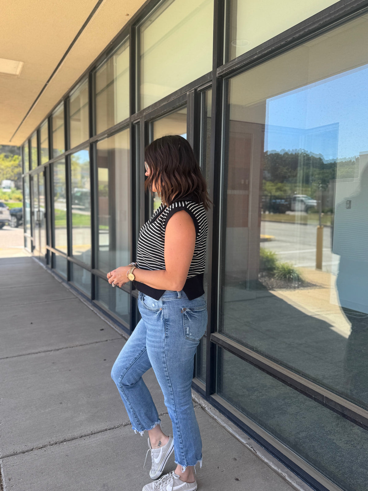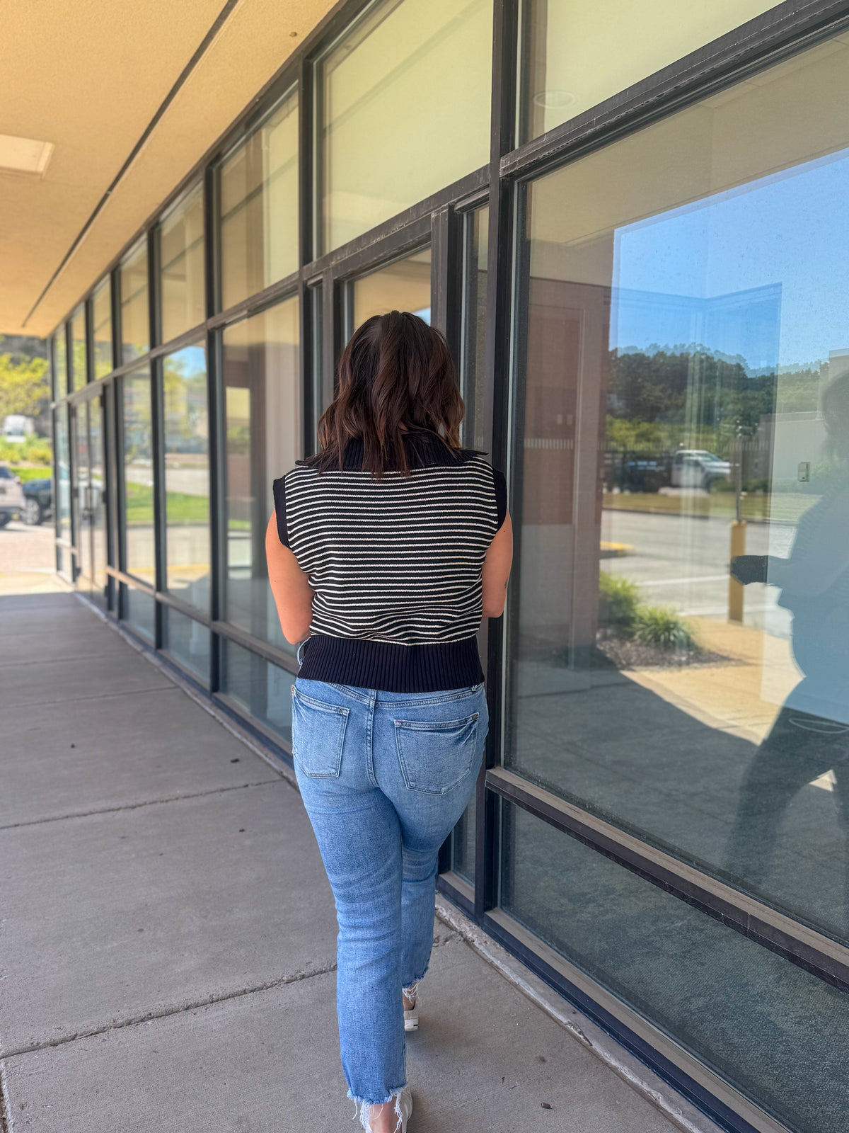 This Knit Top Is Definitely A Wardrobe Staple For The Spring Season. Soft Knit Construction Shapes This Striped Top That Offers A Collared V-Neckline And Sleeveless Cut Bodice. The Top Offers A Relaxed Fit Before Ending In A Ribbed Hem.