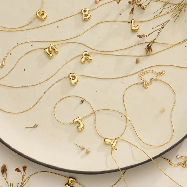 Elevate your jewelry collection with our 18K Gold Dipped Bubble Initial Necklace, a perfect blend of modern elegance and personalized charm. Featuring a sleek, puffy bubble letter pendant, this necklace is crafted with high-quality materials and dipped in 18K gold for a luxurious finish. The minimalist yet bold design makes it ideal for everyday wear or as a thoughtful gift for loved ones. Letters: A, B, C, D, E, F, G, H, J, K, L, M, N, O, P, R, S, T, Size: 16" + 2" , Charm size: 0.5" 18K Gold Dipped Material: Brass