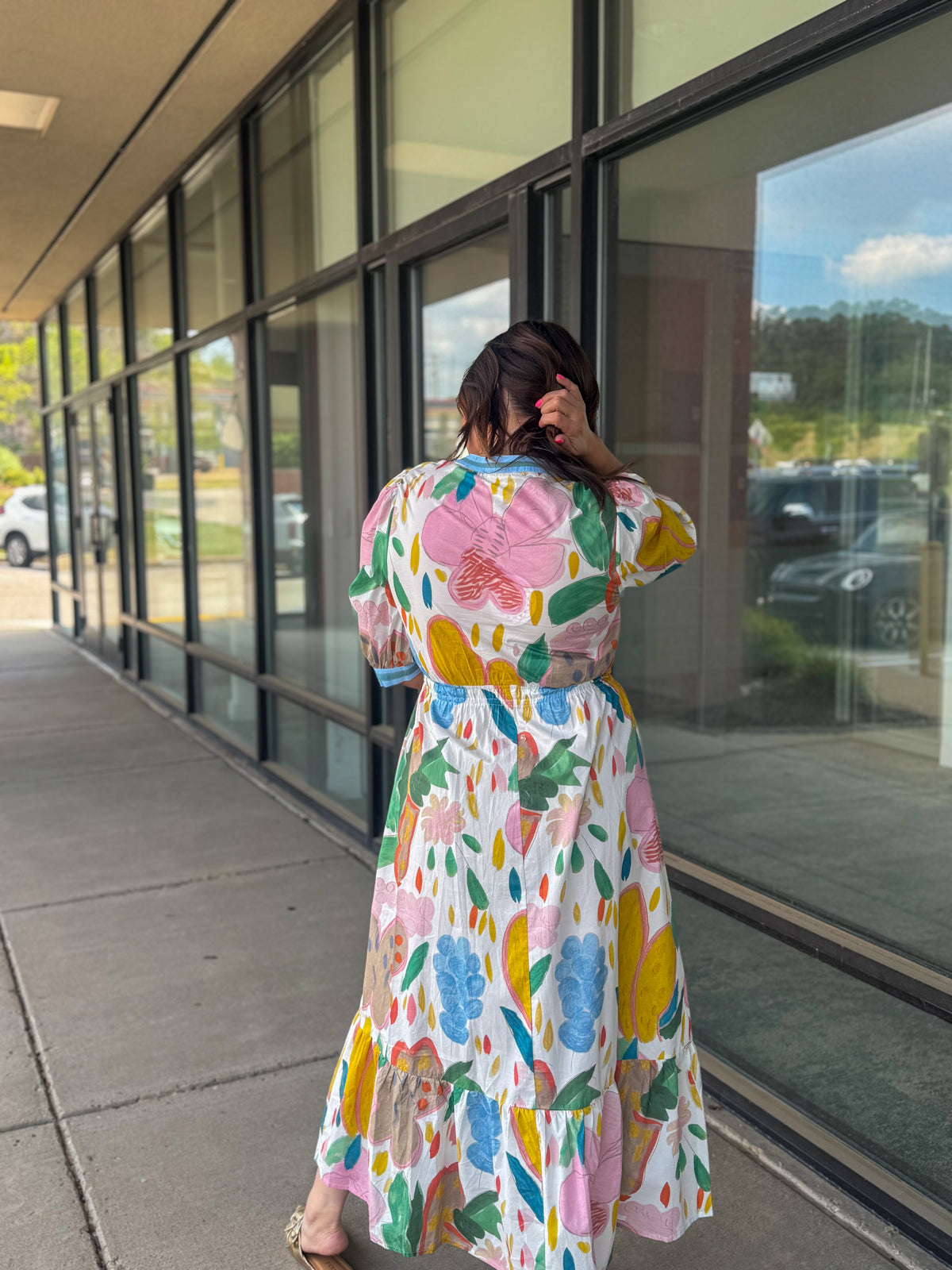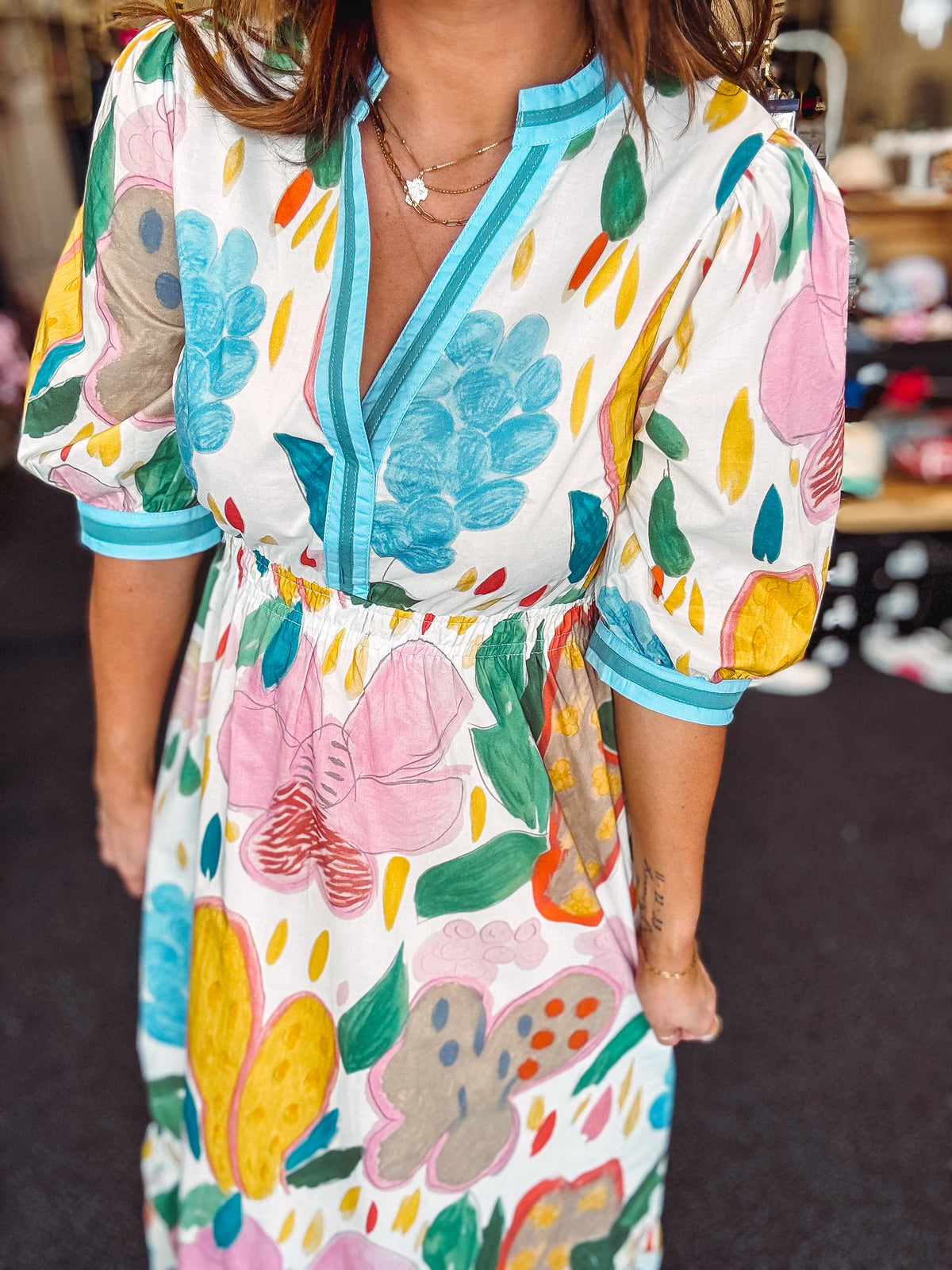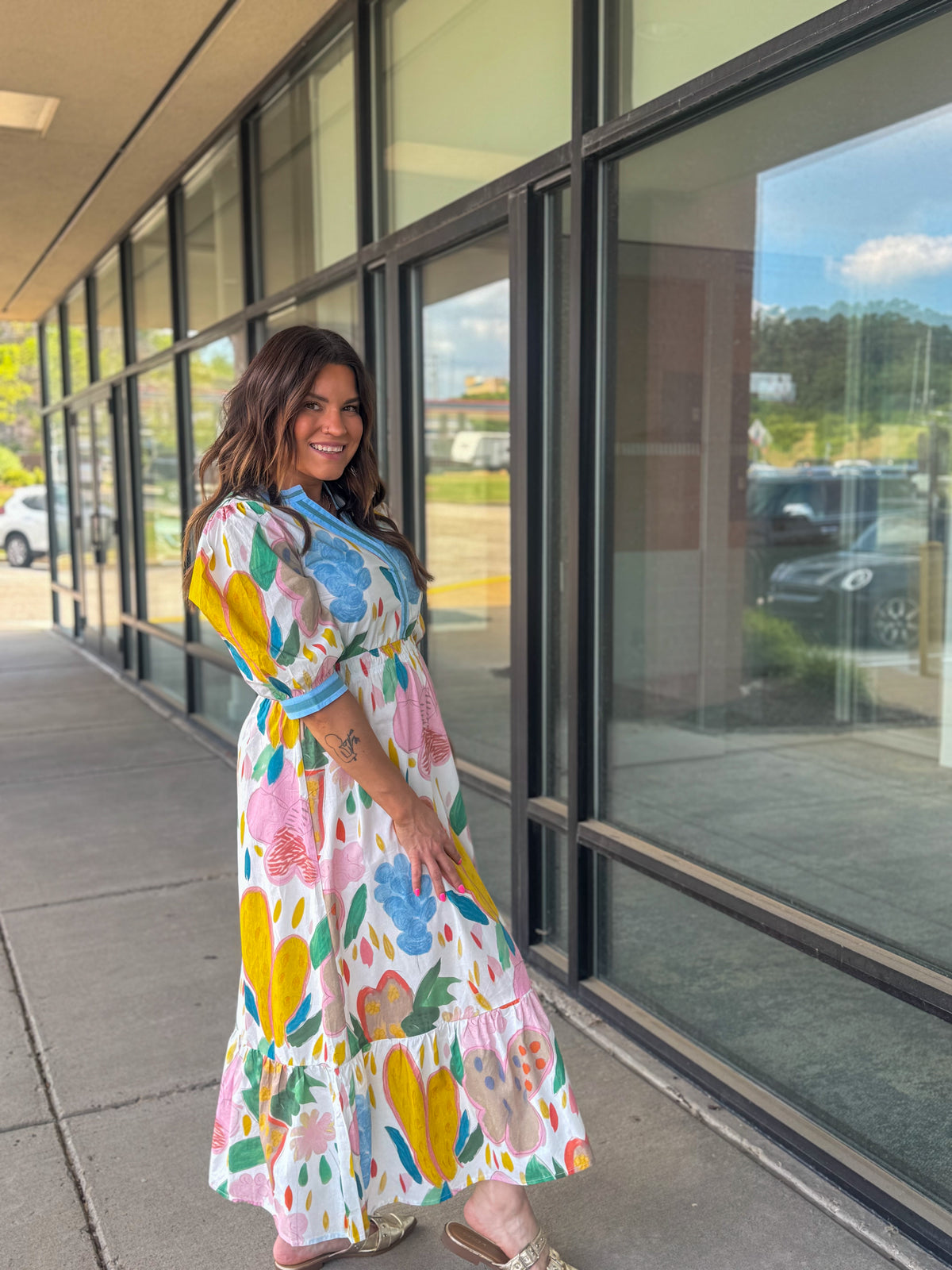 The A Familiar Feeling Fun Floral Print Cotton Denim Midi Dress brings bold energy with a nostalgic twist.