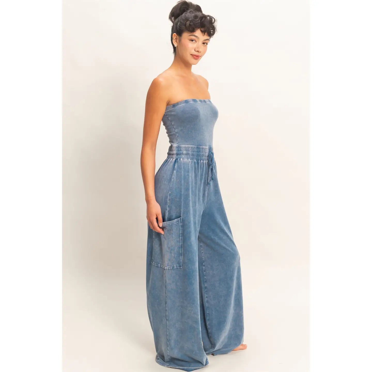This strapless wide-leg jumpsuit features a mineral washed finish on soft cotton span for comfort and style. Designed with a drawstring elasticated waist and large patch pockets to enhance functionality. Elevate your look by pairing it with a statement belt and platform sandals for an effortlessly chic outfit. 95% Cotton 5% Spandex Model Is 5' 7" Tall, 32" Chest, 25" Waist, 36" Hips And Wearing A Size Small Imported. Designed In The USA
