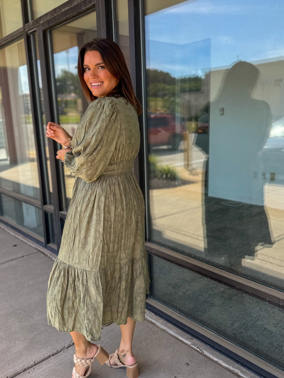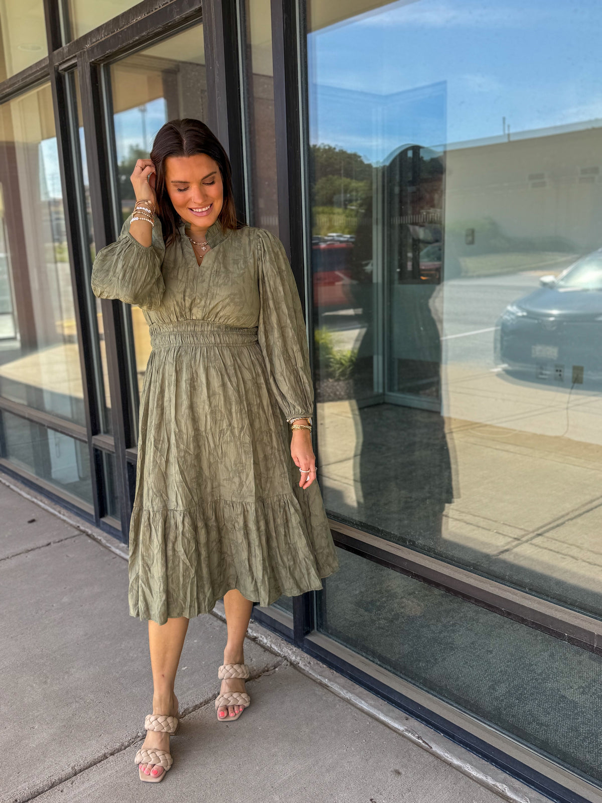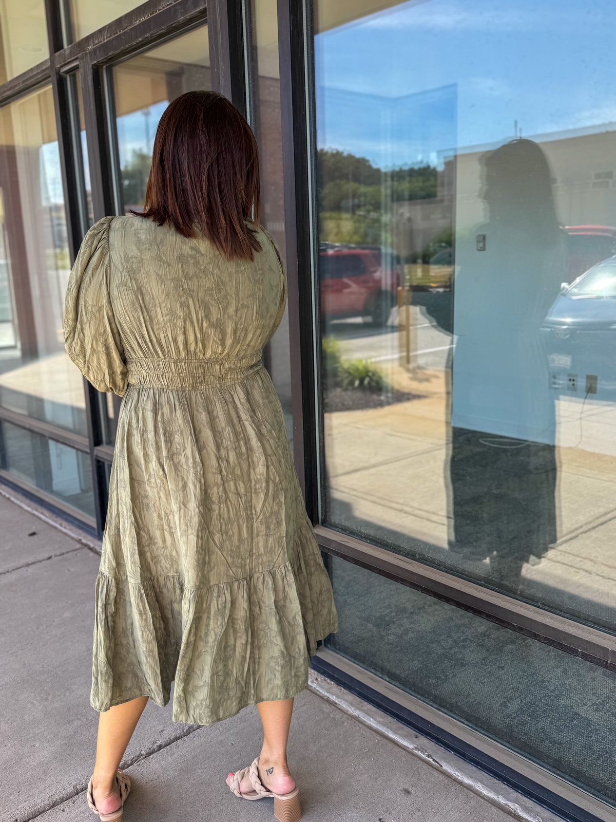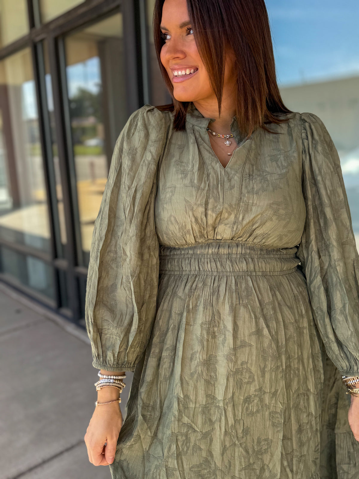Jacquard Midi Dress with Smocked Waist